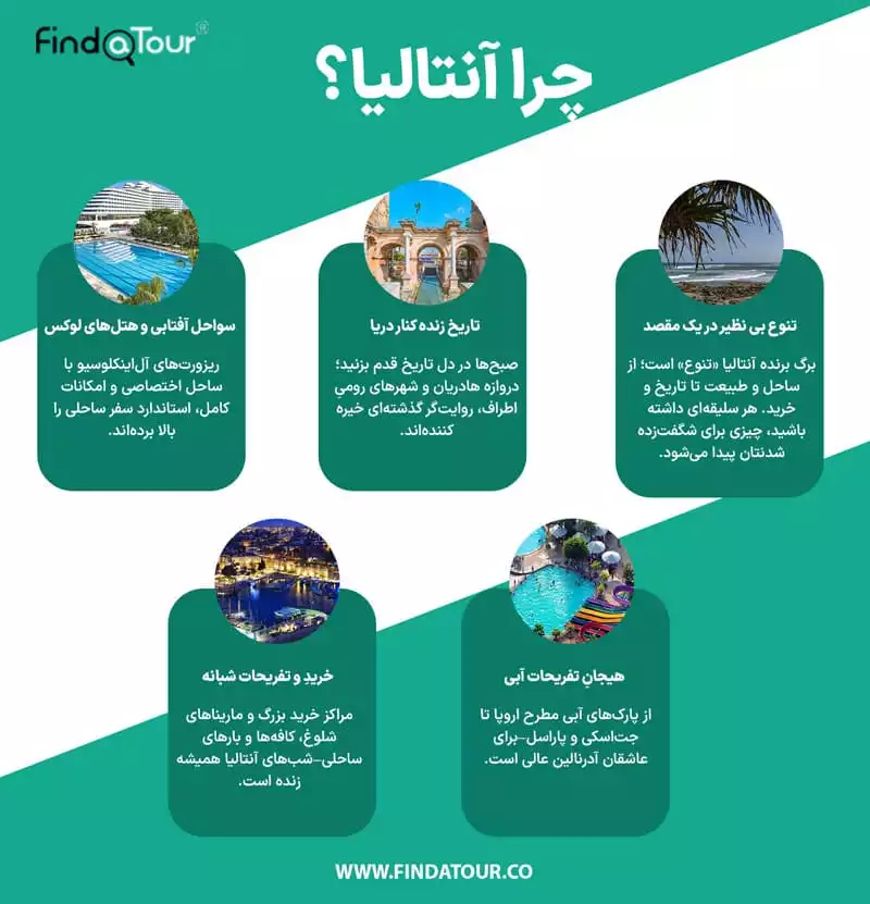برای اینکه بتوانید بهترین تصمیم را بر اساس آب و هوا، فستیوالها و شلوغی هر ماه بگیرید، میتوانید راهنمای کامل ما در مورد بهترین زمان سفر به آنتالیا را مطالعه کنید.